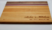 A beautifully designed and hand-crafted cutting board that will surely gain the attention and admiration of all those who behold it. Made of Walnut, Cherry, Purple Heart and the rare American Holly; this cutting board blends these tight grained woods to create an artistic statement.